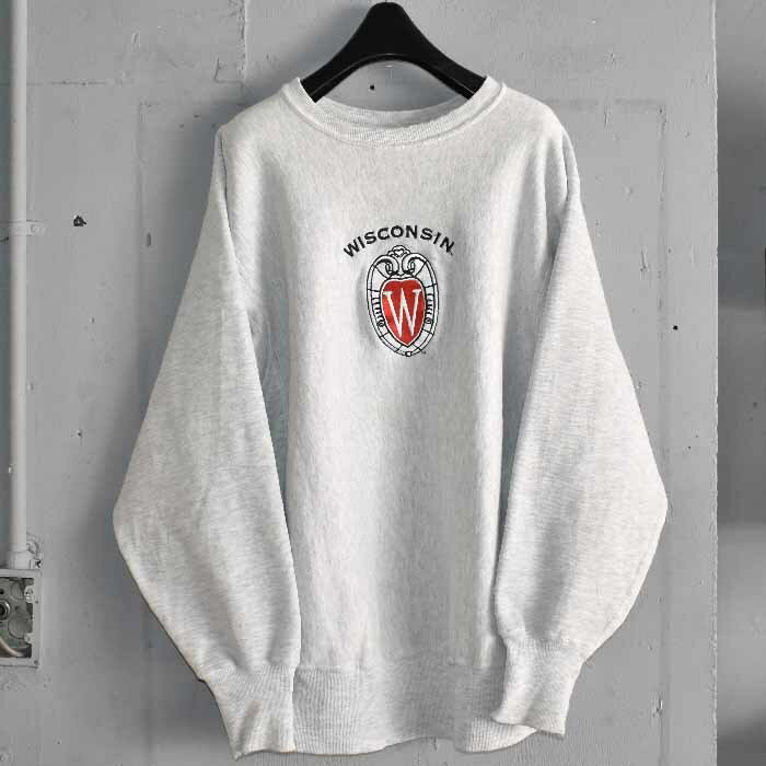 【中古】90's Champion リバースウィーブ "WISCONSIN" クルーネックスウェット 海外直輸入USED品 RIVERSWEAVE リバース 刺繍タグ スウェット グレー カレッジ 春 秋冬 チャンピオン 刺繍 90年代チャンピオンのクルーネックスウェット。