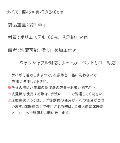 サイズ:幅45×奥行き240cm 製品重量:約1.4kg 材質:ポリエステル100%、毛足約1.5cm 備考:ウォッシャブル対応、ホットカーペットカバー対応 ※洗濯は手洗い、または洗濯ネットに入れて、洗濯機の「手洗いコース」などでお洗濯していただけます。