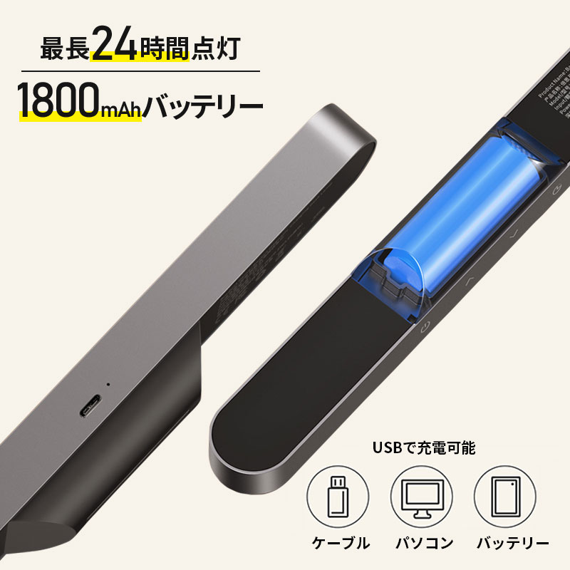 商品仕様 製品サイズ:276×35×42.5mm 製品重量:183g 材質:ABS カラー:スペースグレー 光源:LED 入力電圧:5V パワー:4.5W 電池容量:1800mAh 色温度:4000K 作業時間:高輝度(4時間) 低輝度(40時間) 生産国 中国 包装詳細&製品保証 読書灯* 1、マグネットベース* 1、USB-C ケーブル* 1、取扱説明書* 1 ご注意点 ※製品サイズは、計測方法によりサイズ感が異なる場合がございます。