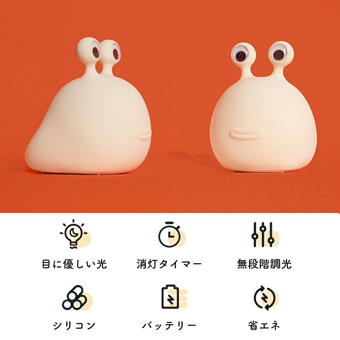 プレゼント ギフト 贈り物 贈物 誕生日 記念日 母の日 父の日 敬老の日 クリスマス バレンタイン ホワイトデー 卒業祝い 成人祝い 就職祝い 合格祝い 入園祝い 入学祝い 進学祝い 退院祝い 結婚祝い 退職祝い 引越祝い 新築祝い 冠婚葬祭 お中元 お見舞い 還暦祝い 長寿祝い お返し様々なシーンで大活躍!玄関 リビング フロア トイレ ダイニング キッチン 寝室 洋室 和室 クローゼット 収納スペース 洗面所 階段 在宅 オフィス 事務 会社 家 マイホーム インテリア ガレージ 車庫 スタイル・特徴なめくじ キャラクター ユニーク 個性的 シリコン 北欧 韓国 充電 コードレス シリコン 調光 タイマー 商品説明なめくじのようなユニークでかわいいデザインのLED卓上ライト視認性の良いLEDの光 目に優しい柔らかい光で夜間でも目が覚めにくい両目をカチッと合わせるとライトが点灯する簡単操作設計左右の目を2秒以上合わせると明るさを調節することができます消灯タイマー機能付き 消灯タイマーをONにすることで15分後に自動でライトをOFFにします1200mAhのバッテリーを内蔵しており、コードレスで場所問わずご利用頂けますシリコン製の柔らかな素材で子供やペットがいても安心